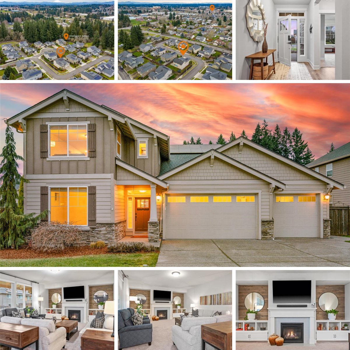 A total standout in Salmon Creek that delivers style, space and flexibility. Versatile main-level bedroom with an adjacent bathroom is ideal for guest or multi-generational living. 4 additional large bedrooms up + open bonus room/loft space. The true hub of this home is the expansive great-room and entertainer-ready kitchen. Statement-size island centerpiece with generous seating is perfect for gatherings, casual meals, or a buffet-style spread. Completed with quartz countertops, quality stainless appliances, pantry and dining area with built-in buffet cabinetry. Smartly integrated semi-private built-in workstation offers space for remote work, homework, or household organization. The primary suite delivers space for privacy and all the amenities you’d expect. An-easy-to-enjoy backyard with a covered patio, hot tub and green lawn for play or pets. Great storage space, 3 car oversized garage and solar panels that enhance energy efficiency. Near greenspace with accessible trail from neighborhood. Prime location convenient to amenities, groceries, restaurants, freeways. Kitchen refrigerator included + home warranty for buyer. This home hits all the marks!